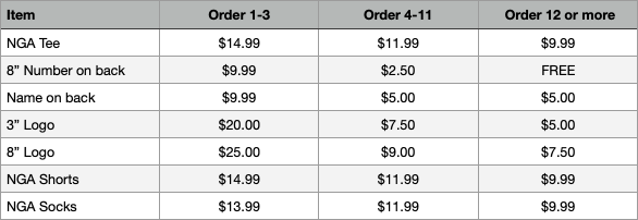 Use the product tables that follow below to select the items you wish to order for your kit. Use the 'Customize' button to add logos, numbers, or names to each jersey.