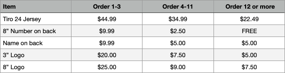 Use the product tables that follow below to select the items you wish to order for your kit. Use the 'Customize' button to add logos, numbers, or names to each jersey.
